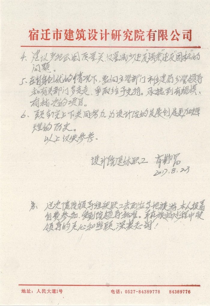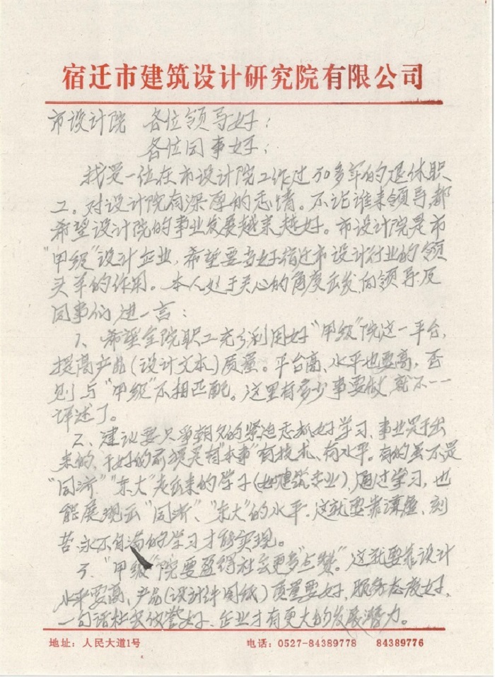 我是一位在市設(shè)計院工作過30多年的退休職工,對設(shè)計院有著深厚的感情。不論誰來領(lǐng)導,都希望設(shè)計院的事業(yè)發(fā)展越來越好。市設(shè)計院是是甲級設(shè)計企業(yè),希望要當好宿遷市設(shè)計行業(yè)的領(lǐng)頭羊的作用。本人處于關(guān)心的角度出發(fā),向領(lǐng)導及同事們進一言: