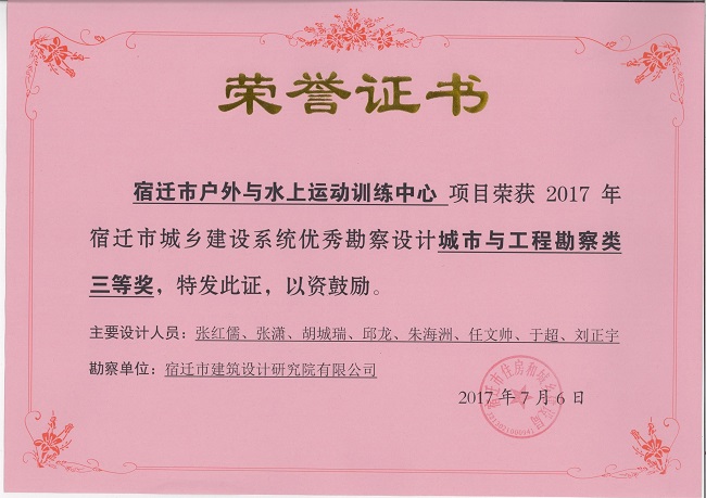 2、宿遷市戶外與水上運(yùn)動(dòng)訓(xùn)練中心項(xiàng)目中獲城市與工程勘察類三等獎(jiǎng)